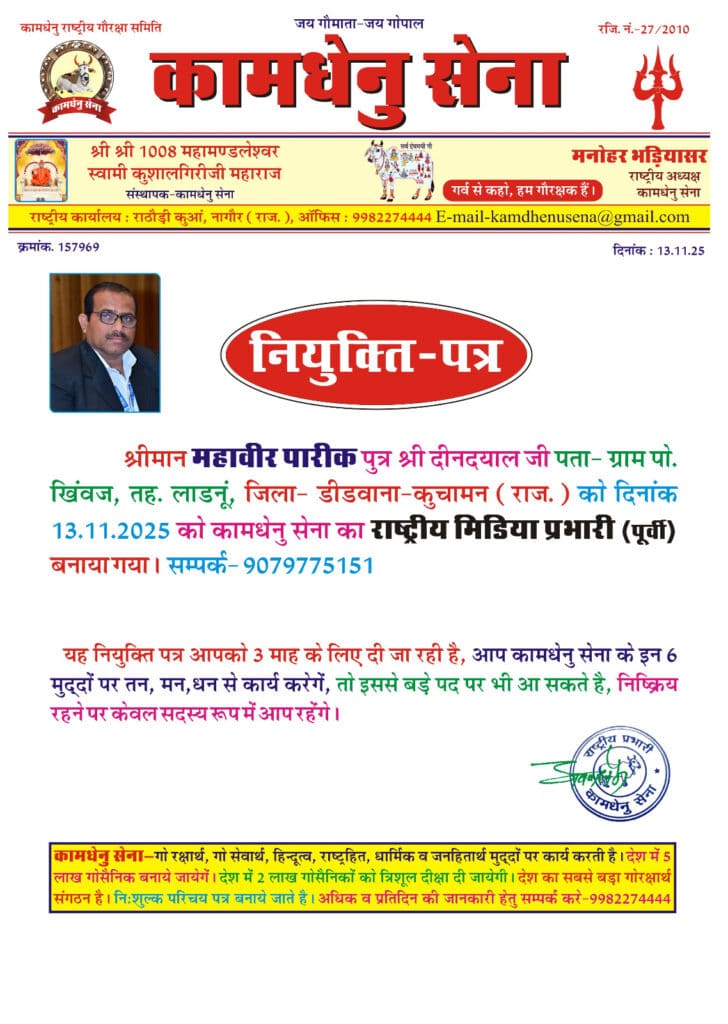 राजस्थान,लीगल अम्बिट के सी.ई.ओ.श्री महावीर पारीक राजस्थान को कामधेनु सेना का राष्ट्रीय मीडिया प्रभारी (पूर्वी भारत) नियुक्त किया गया.कामधेनु सेना के संस्थापक श्री श्री 1008 महामण्डलेश्वर स्वामी कुशालगिरीजी महाराज व राष्ट्रीय अध्यक्ष श्री मनोहर भड़ियासर एवं (कामधेनु सेना) के निर्देशानुसार, संगठन की राष्ट्रीय कार्यकारिणी द्वारा श्री महावीर पारीक पुत्र श्री दीनदयाल जी, निवासी खिंवज, तहसील लाडनूं, जिला डीडवाना-कुचामन (राजस्थान) को कामधेनु सेना का राष्ट्रीय मीडिया प्रभारी (पूर्वी भारत) नियुक्त किया गया है।