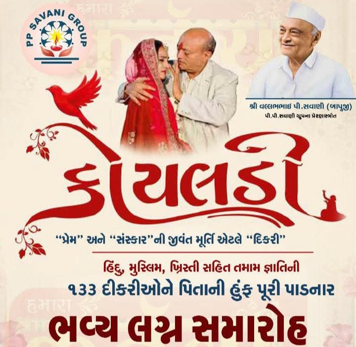 सूरत | बुधवारसूरत के पी.पी. सवाणी परिवार द्वारा प्रतिवर्ष की भांति इस वर्ष भी पिताविहीन बेटियों के लिए भव्य सामूहिक विवाह समारोह का आयोजन किया जा रहा है। आगामी 20 व 21 दिसंबर को पी.पी. सवाणी चैतन्य विद्यासंकुल, अब्रामा में ‘कोयलड़ी’ थीम पर 133 पिताविहीन बेटियों का सामूहिक विवाह संपन्न होगा।